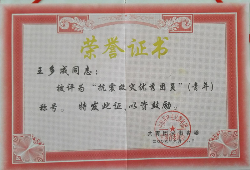 2008年榮獲抗震救災優(yōu)秀青年稱(chēng)號榮譽(yù)證書(shū)