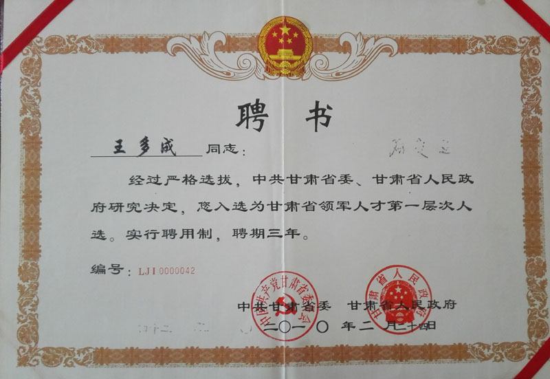 2010年榮獲入選為甘肅省領(lǐng)軍人才第一層次人員證書(shū)