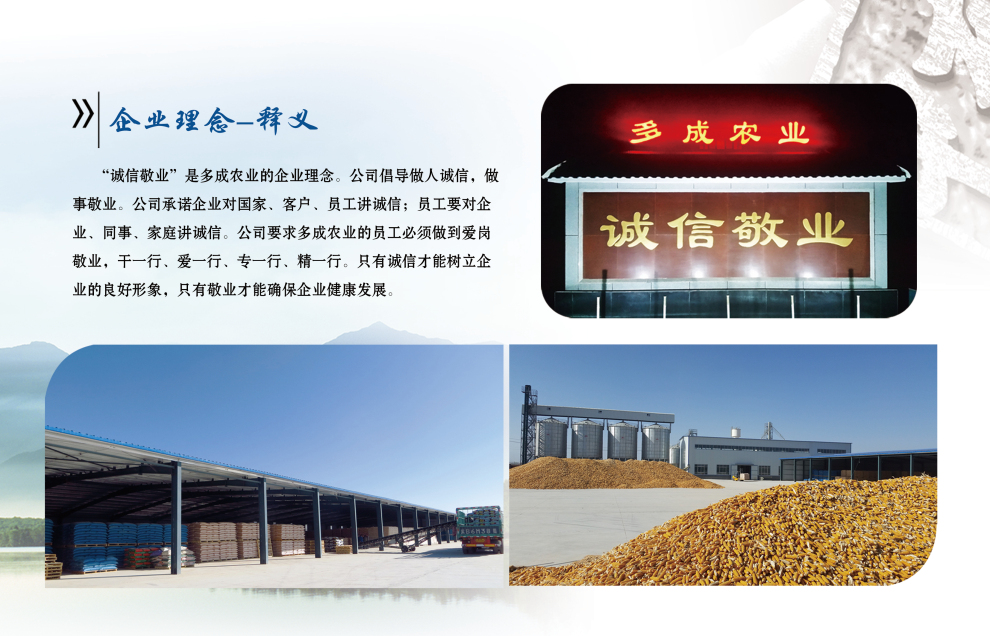 "誠信敬業(yè)是多成農業(yè)的企業(yè)理念。公司倡導做人誠信,做事敬業(yè)。公司承諾企業(yè)對國家、客戶(hù)、員工講誠信;員工要對企業(yè)、同事、家庭講誠信。公司要求多成農業(yè)的員工必須做到愛(ài)崗敬業(yè),干一行、愛(ài)一行、專(zhuān)一行、精一行。只有誠信才嫩個(gè)樹(shù)立企業(yè)的良好形象,只有敬業(yè)才能確保企業(yè)健康發(fā)展